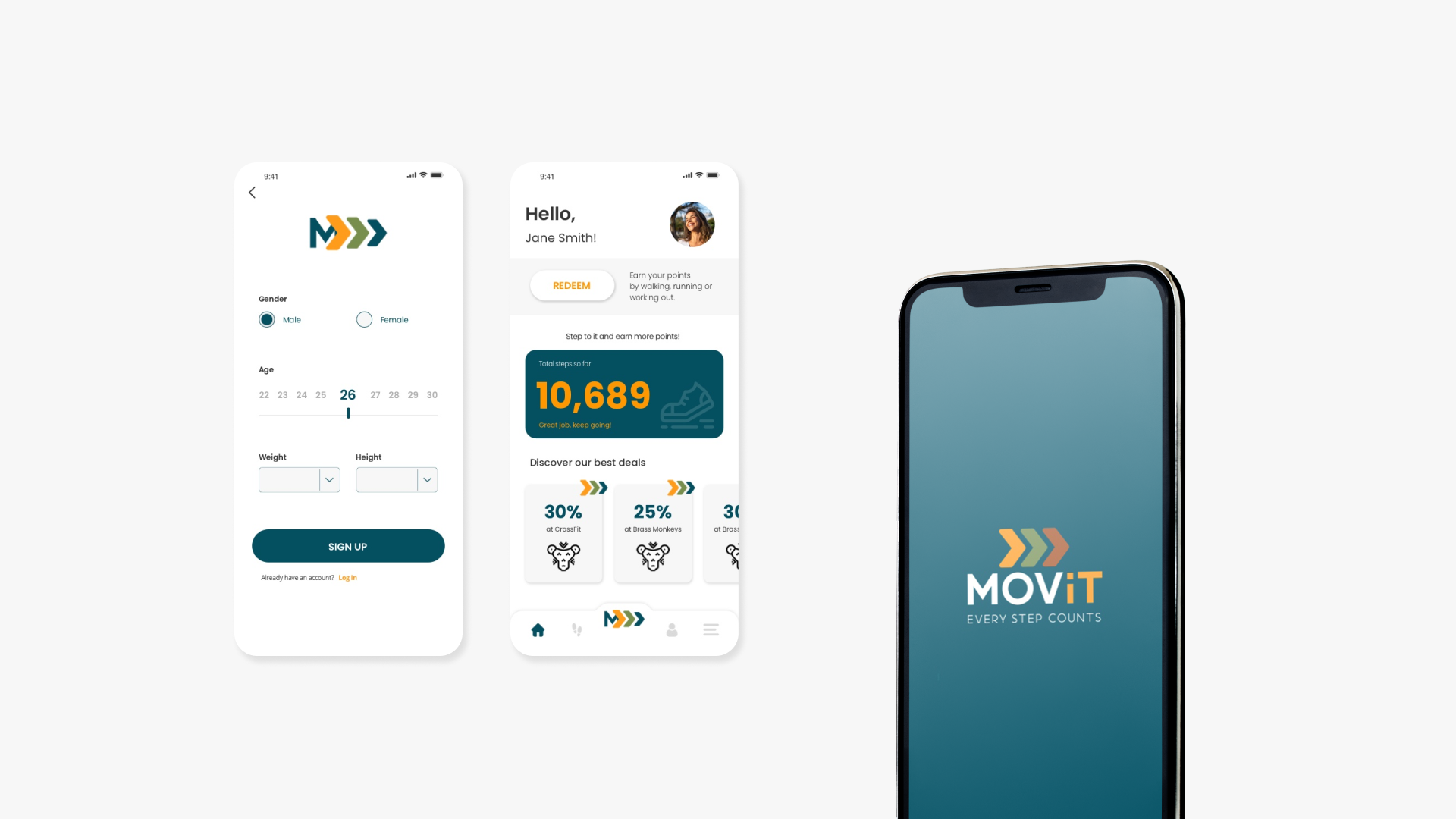 Movit is a mobile application that links to health data, counting a user’s steps and offers exclusive deals and rewards by partnering up with leading athletic vendors.